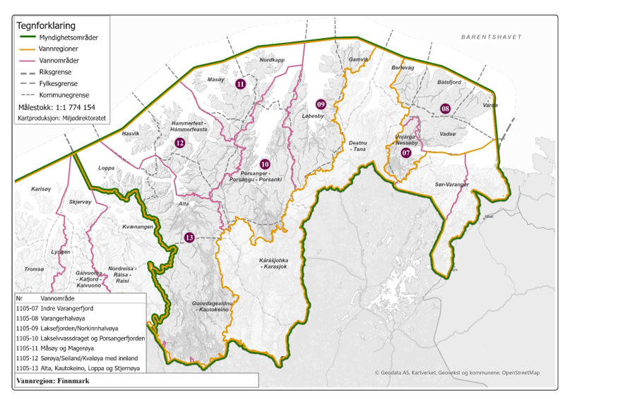 For å få til dette er Norge delt inn i vannregioner, som ledes av fylkeskommunene. Hver vannregion er igjen delt inn i flere vannområder. I Finnmark finnes det sju vannområder.