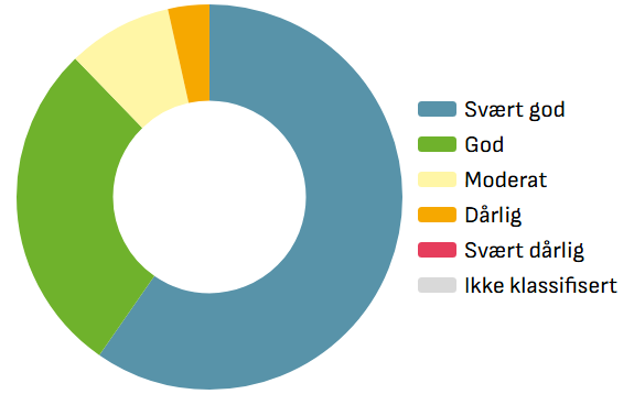 - 87,7 % av naturlige vannforekomster har enten svært god eller god økologisk tilstand